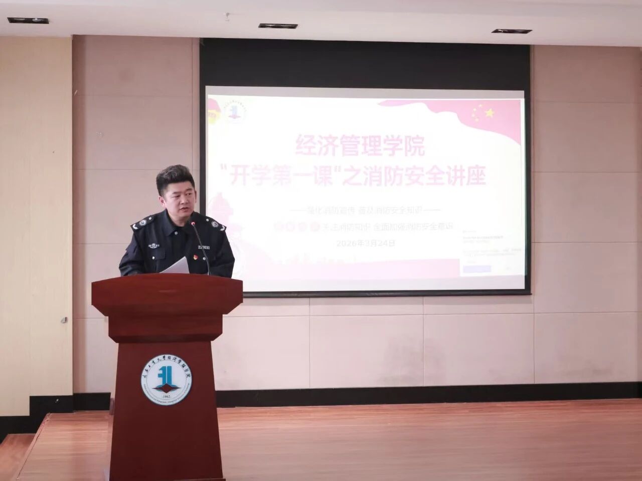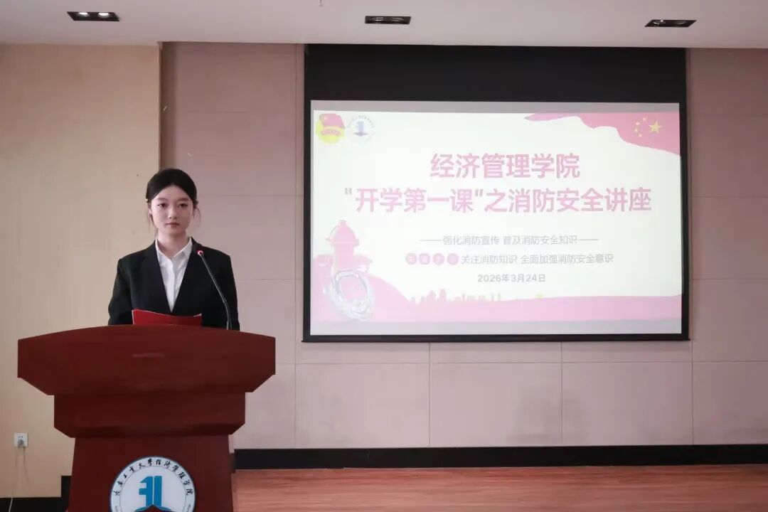 (新闻网讯)为全面贯彻党的二十大及二十届历次全会精神,深入落实新时代立德树人根本任务,持续提升思想政治工作质效,引导青年学子坚定理想信念、勇担时代使命,经济管理学院联合学校安全处于3月24日共同举办“开学第一课”系列教育活动之“护航成长第一课”消防安全主题活动。