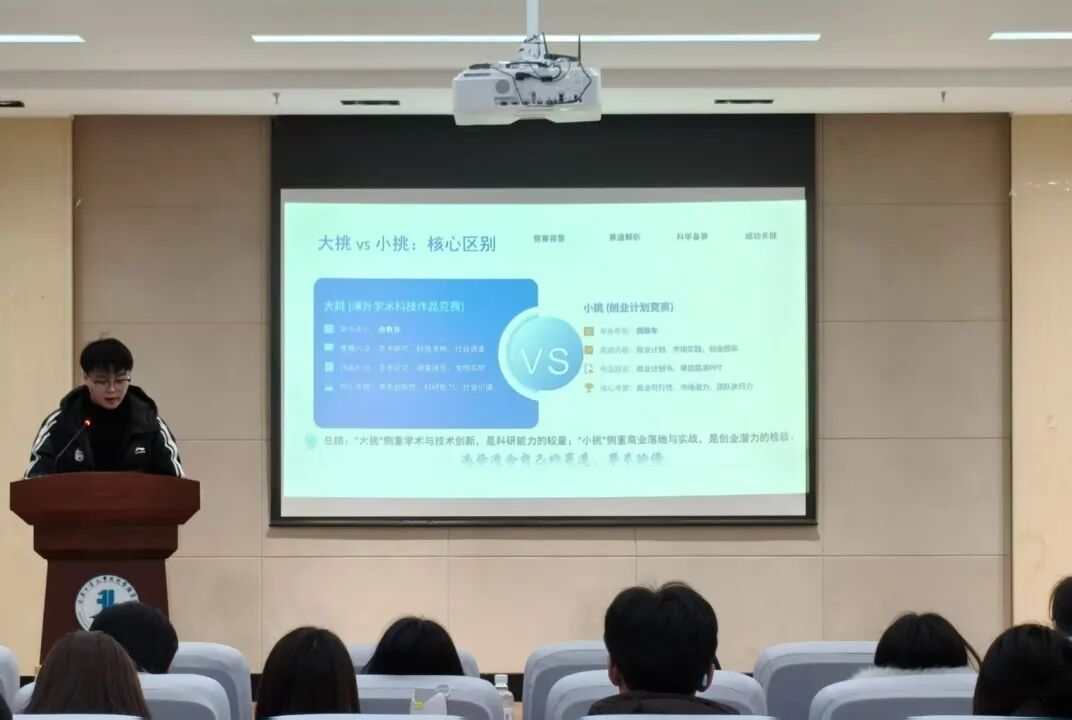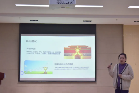 刘慧为同学们系统梳理了赛事类别、赛程安排及评审标准,并结合往届优秀作品案例,深入解析团队组建、报告撰写、答辩展示等关键环节的核心要点。她指出,优秀的作品不仅需要扎实的专业知识,更要有敏锐的问题意识和严谨的治学态度。她勉励同学们结合专业特色,积极备赛参赛,在实践中不断提升自我、实现成长。