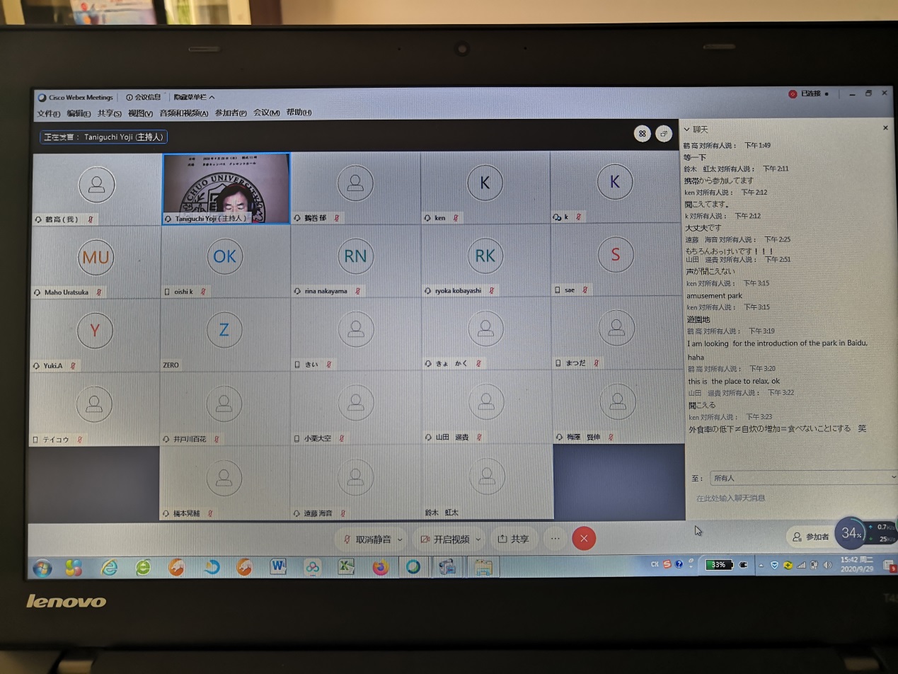 新冠疫情背景下,日本绝大部分高校2020年秋季学期仍主要采用在线教学方式,中央大学使用的教学平台是Webex。高鹤老师首先参加的是大三年级的学术研究汇报会,接着参加了大二年级的小组讨论课。在谷口教授的引荐下,高老师全程英语介绍了经济管理学院的各专业情况、个人学术研究方向和学术成果,以及访学期间的合作与交流情况,受到学生们的热烈欢迎。经过介绍,使得外国大学生对中国高校有了更多客观了解。