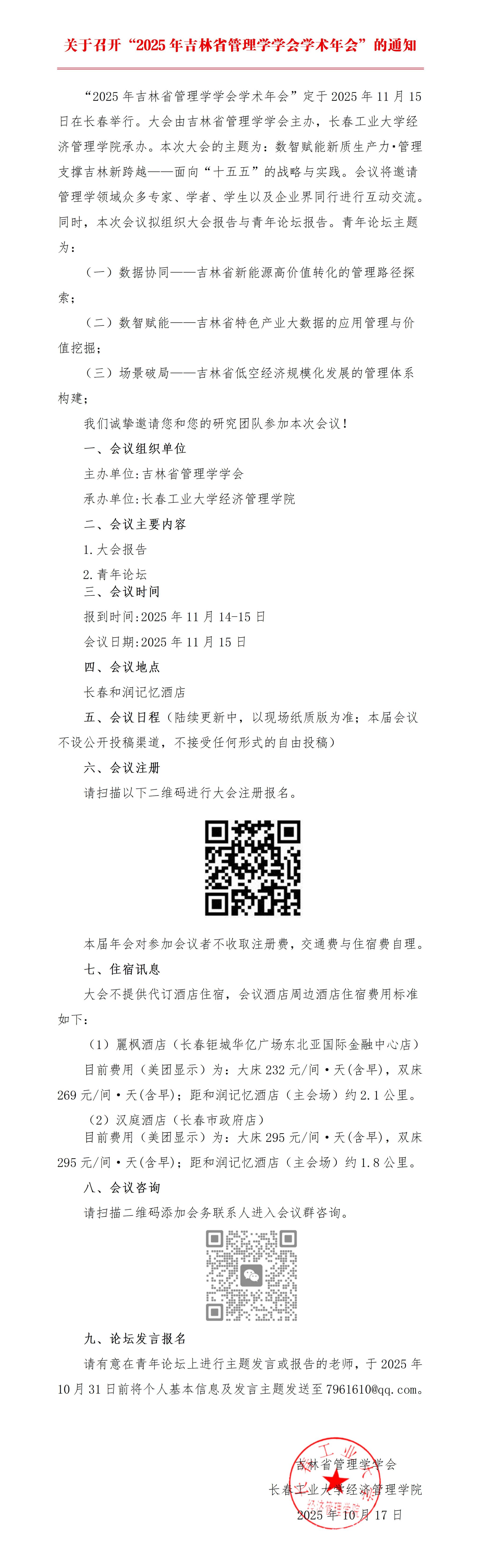 关于召开“2025年吉林省管理学学会学术年会”的通知
